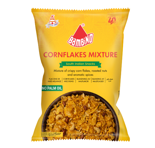 Bambino Corn Flakes Mixture - 170g is a delicious and crunchy snack made with crispy corn flakes, savory nuts, and flavorful spices. Perfect for on-the-go munching, it offers a delightful balance of taste and texture in every bite. A great choice for tea-time or anytime cravings!