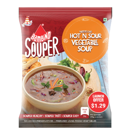 Bambino Hot and Sour Vegetable Soup Powder (40g) brings the perfect blend of spicy and tangy flavors in an instant mix. Made with premium vegetables and aromatic spices, it delivers a rich, restaurant-style taste in minutes. Just add hot water for a delicious, comforting soup anytime!