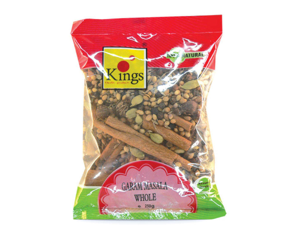 Kings Garam Masala Whole (250gm) is a premium blend of whole spices, carefully selected to enhance the aroma and flavor of your dishes. Ideal for traditional Indian cooking, this mix adds warmth and depth to curries, biryanis, and more. Fresh, aromatic, and full of natural goodness!