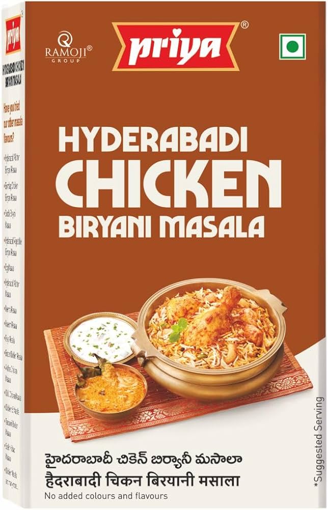 Priya Hyderabadi Chicken Biryani Masala (50g) is a rich and aromatic spice blend that captures the authentic flavors of Hyderabadi cuisine. Made with a perfect mix of premium spices, it enhances the taste of your chicken biryani, delivering a deliciously traditional and flavorful experience. Easy to use, it ensures a restaurant-style biryani at home.