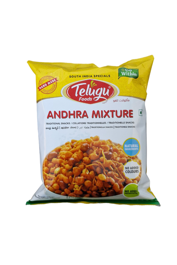 Telugu Andhra Mixture (170g) is a crunchy and spicy South Indian snack made with a flavorful blend of fried lentils, peanuts, sev, and aromatic spices. Perfect for tea-time or as a munching delight!