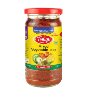 A flavorful blend of fresh vegetables, marinated in authentic Telugu spices for a tangy and spicy taste. Perfectly balanced with mustard, fenugreek, and aromatic oils for a rich, homemade flavor. Ideal with rice, roti, or as a zesty side dish. Enjoy the bold taste of Andhra-style pickle in every bite!
