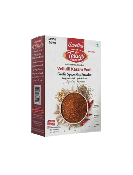 Telugu Vellulli Karam Podi is a bold and spicy garlic chutney powder that brings authentic South Indian flavors to your meals. This 100g pack of Telugu Vellulli Karam Podi is perfect for sprinkling over idlis, dosas, or steamed rice, adding an instant burst of flavor. Its rich, aromatic profile is crafted with high-quality ingredients, ensuring taste and freshness. Whether you’re a busy professional or a home chef, Telugu Vellulli Karam Podi makes meal preparation quick, easy, and delicious.